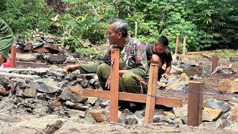 Pengerjaan pondasi tersebut dipimpin langsung oleh Kepala Tukang Serka Julianta bersama anggota Satgas TMMD dan masyarakat setempat. Tahapan pekerjaan diawali dengan penggalian tanah, pemasangan batu pondasi hingga penyusunan material sebagai dasar utama bangunan.